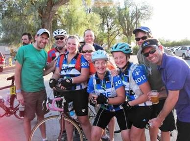 With new motivation, Ross and I slow-pedaled together to the finish line. We passed riders along the way, including a guy who had dismounted and was walking his bike, just 2 miles from the finish. We turned and coasted down a 1-mile stretch to the Furnace Creek Ranch, where rows of cheering people with cow bells lined the finish. It was 2:30 pm, and we had covered the course in almost exactly 6 hours of riding time. This was slow for a century ride under normal conditions. Total time for the ride including breaks was 8 hours, and I am sure the majority of the 2 hours spent at rest stops came in the final ¼ of the route. A little girl with diabetes gave me a medal, and I walked my bike to the medical tent for the mandatory checkin. I saw that the cots were all taken with riders hooked up to IV bags. After I convinced the EMT that I was fine, I walked my bike to my room, showered, and changed. My blood glucose was still high, so I took a shot of insulin, then changed the insulin and infusion site in my pump. I don’t know if the insulin on the ride was not effective, but after the shot I leveled out and felt great. Immediately. I drank a water bottle and grabbed a beer at the finish tent, then sat down in the shade with Ross and Jeff to watch for Don, Renea, Elizabeth and Victoria. We cheered for everyone who rode across. We swapped stories with other riders we had encountered that day, and I told everyone of the magic qualities of pickle juice. Don finished, and we held his bike while he showered and changed. While still waiting for the women to finish, I had another beer and ate a sandwich. Solid food. The course would close at 4:45 pm, and it was nearing 4:30. Finally, Renea, Elizabeth and Victoria finished, followed by a group of JDRF coaches who had supported them to the finish. They were not the last finishers, and probably the happiest to reach Furnace Creek. They completed 80 miles and still had those big smiles.